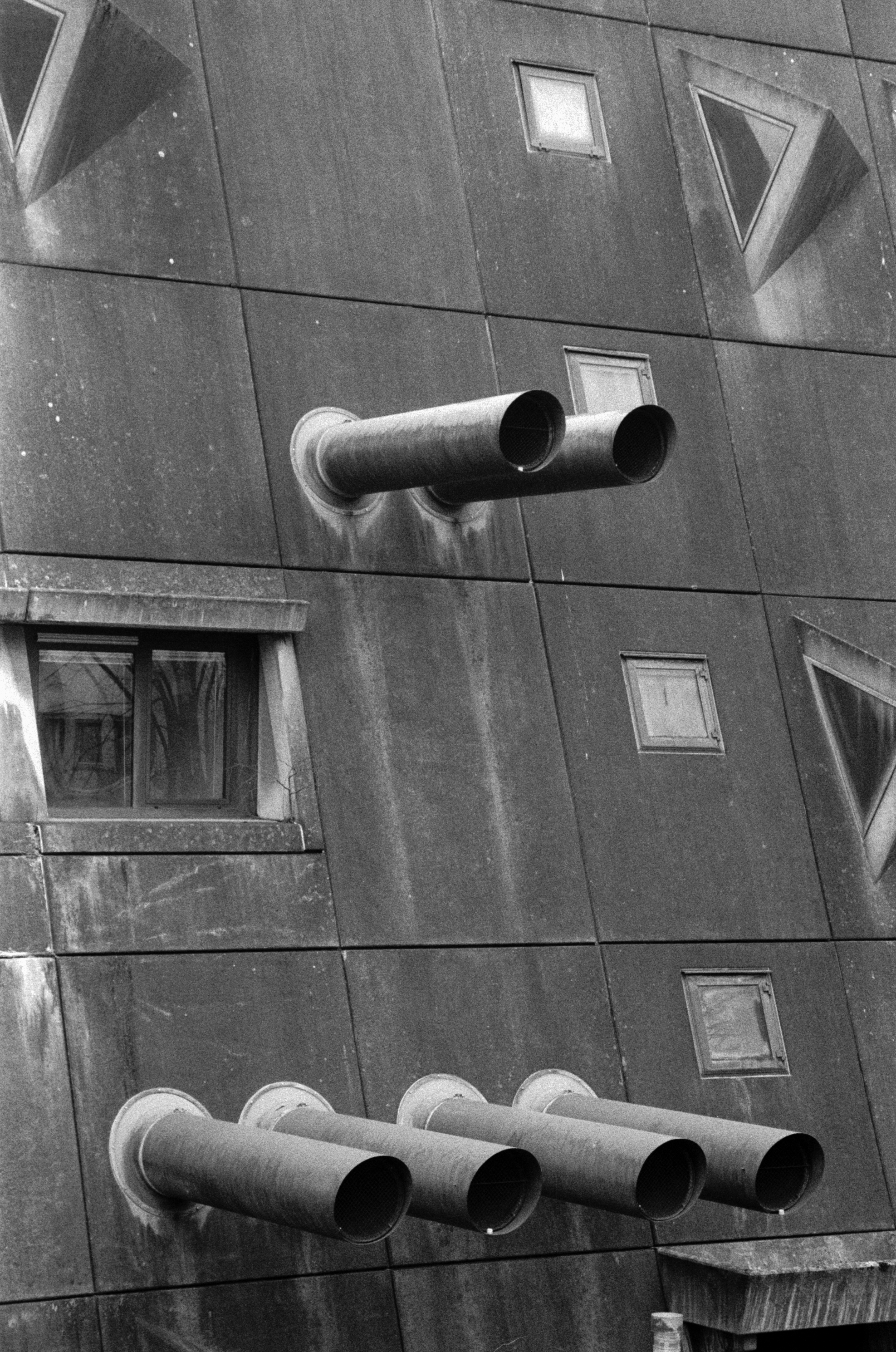 The buildings design is singular with its pyramid shape and striking ventilation pipes that protrude from its walls. From the beginning the design from Gerd Hänska was seen as controversial, especially due to the buildings original use as an animal testing facility.