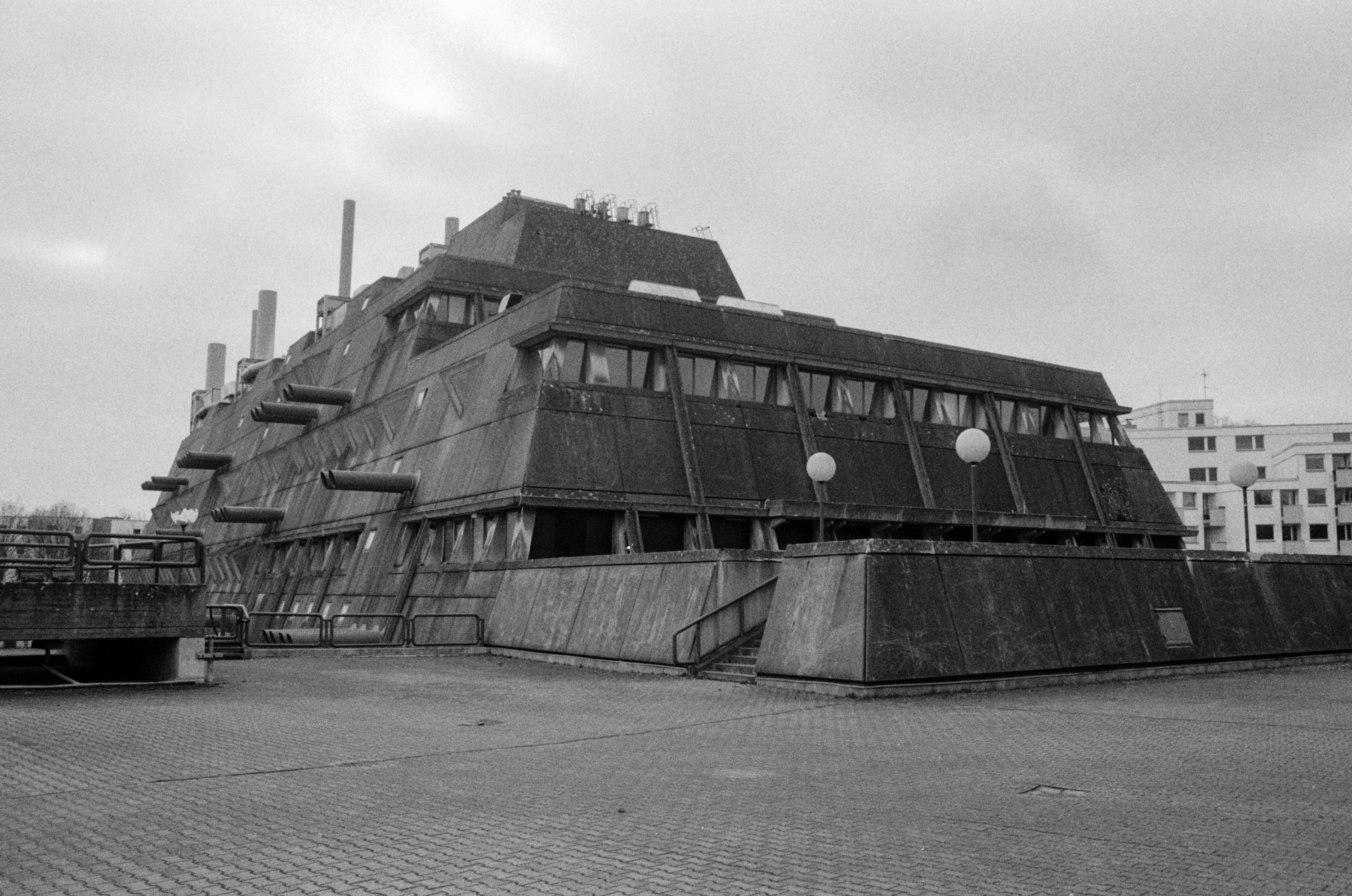 Mäusebunker’s design is singular with its pyramid shape and striking ventilation pipes that protrude from its walls. From the beginning the design from Gerd Hänska was seen as controversial, especially due to the buildings original use as an animal testing facility.