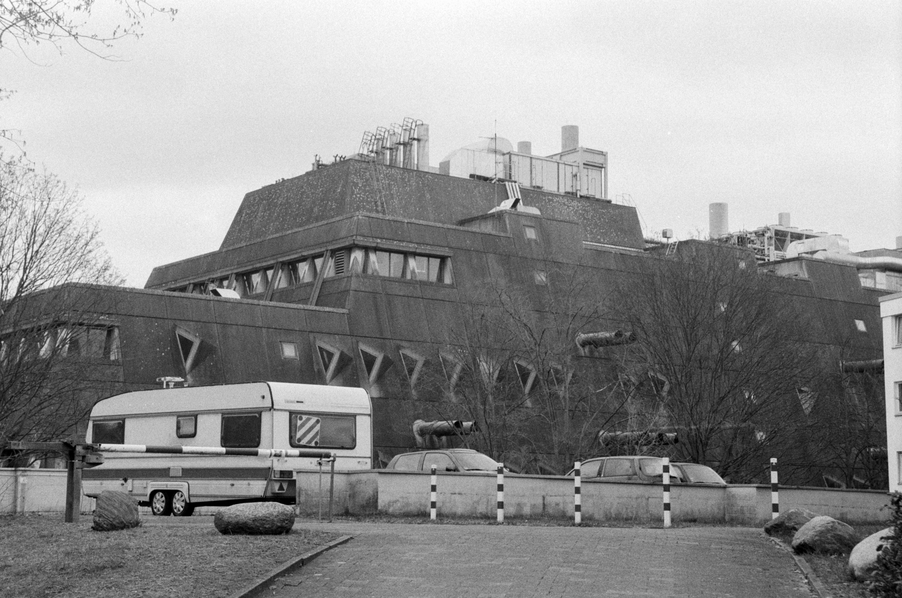 A low design that built at the center was used to help incorporate the building into its suburban surroundings. The structure features many different geometric shapes and angles, resulting in a building with no two sides the same and very little symmetry to be found. Directly opposite stood Mäusebunker.